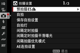 若要显示拍摄设置,请在照片拍摄显示中按下 MENU/OK 并选择 A拍摄设置)选项卡。