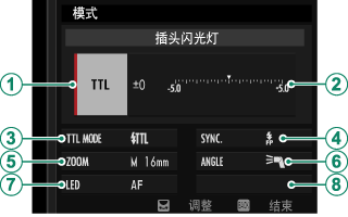 当安装并开启了选购的热靴卡口闪光灯组件时,以下选项可用。