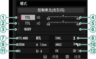 闪光灯组件最多可分为三组(A、B 和 C),每组的闪光灯模式和闪光级别可分别进行调整。