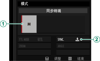 若内置闪光灯降下且热靴上没有安装闪光灯组件或安装了不兼容的闪光灯组件,同步终端 将会显示。