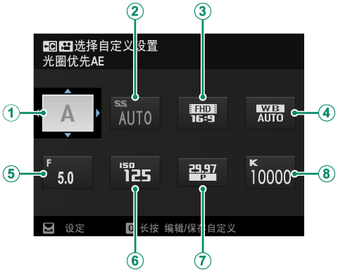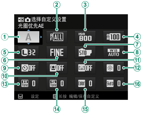 * 如果 F选择自定义设置 当前未选择设置库,则将显示拍摄模式。