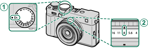 若在使用带光圈环的镜头,请将光圈环旋转至 A(自动)。若镜头未配备光圈环,则先将 D按钮/拨盘设置 > 光圈设定 选为 自动 或 自动+手动,然后旋转前指令拨盘直至光圈值显示为白色。