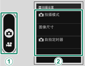 | B | 向左 | 显示拍摄菜单、设置菜单和网络/USB 设置菜单(a菜单触摸控制)。 |