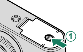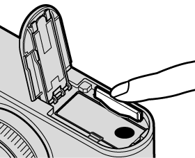 若要取出电池,请如图所示将电池释放搭扣推至一旁,然后将电池从相机中滑出。