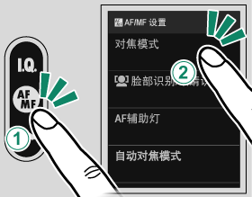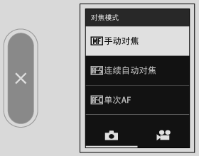 在副 LCD 显示屏上轻触 GAF/MF 设置(A)并轻触 对焦模式(B)。