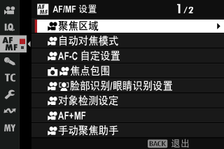 若要显示 AF/MF 设置,请在视频拍摄显示中按下 MENU/OK 并选择 GAF/MF 设置)选项卡。