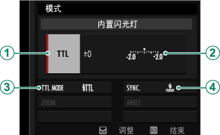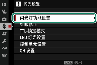 2. 选择 F闪光设置 菜单中的 闪光灯功能设置。相机将显示用于内置闪光灯的选项。