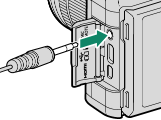 遥控快门装置可用于长时间曝光。当使用选购的 RR-100 遥控快门装置或从第三方供应商购买的电子快门装置时,请将其连接至相机的麦克风/遥控快门装置连接插孔。